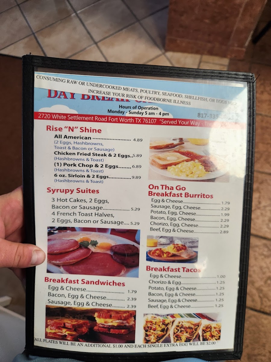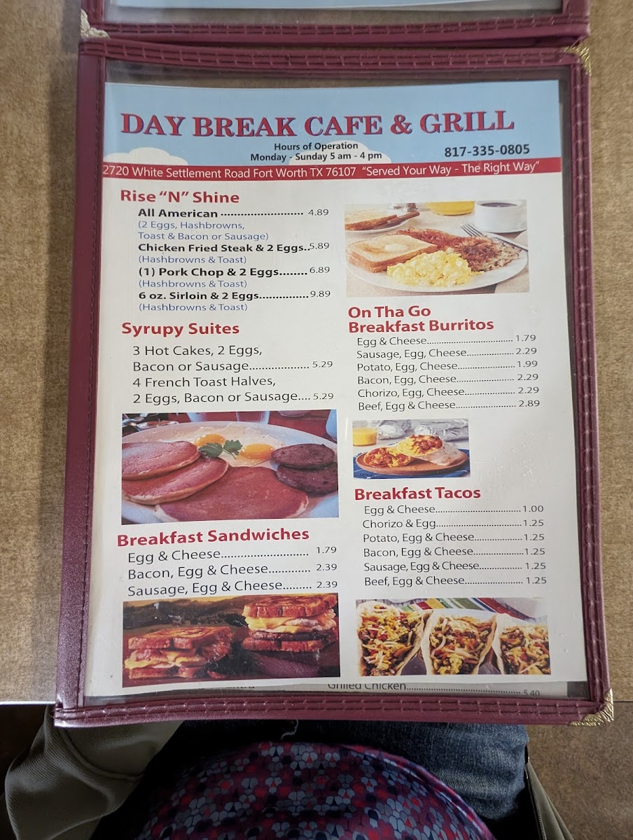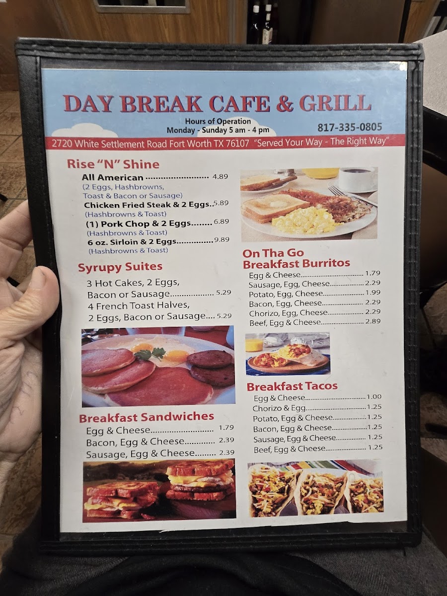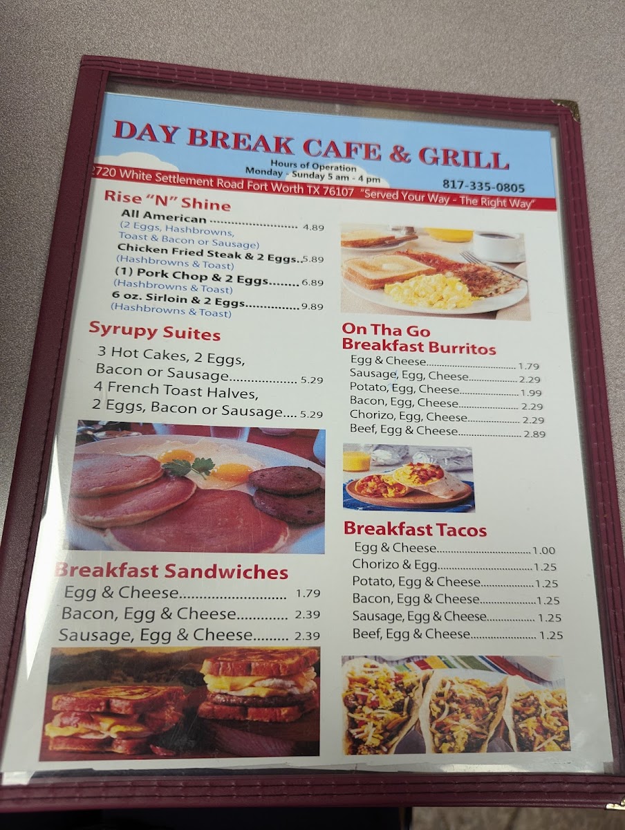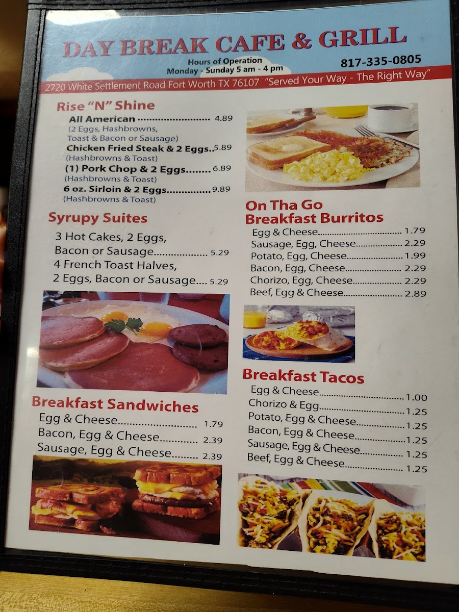 Welcome to Daybreak Cafe & Grill, a cozy culinary gem nestled at 2720 White Settlement Rd, Fort Worth, TX. This charming establishment focuses on delivering delightful comfort food that feels like home-cooked goodness. The menu is rich with options that cater to all tastes, featuring the Zesty Tortilla Bowl for health-conscious diners and hearty sandwiches like the classic BLT and grilled cheese for those seeking a satisfying bite.